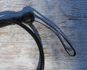 3 1/2ft Black Solid Colour 16 plait Pocket Snakewhip - shot loaded, plaited belly and recognisable, instantly, in that "Murphy Whip" pattern of old. Every snakewhip I make is finished in the same way, in a short under one over one sennet and then the strands pair up for the last inch and carry into the heel knot. Also available black with red or purple or highlights. If a 3ft snake whip is for you, please let me know, I'm happy to make that happen.