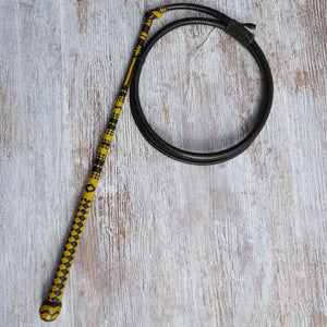 Full Plait 12-plait Australian Stock Whip in Black with a Yellow and Black Handle. Handmade by Mike Murphy, this naturally weighted 12plait thong is a matched with a 2-toned full plait 16-plait spring steel lined 21in handle. Of course if you'd like something a little different made, let me know, I'm happy to make that for you.