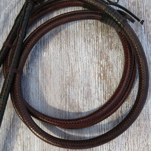 Matched Pair of 5ft Full Plait 12-plait Australian Competition Stock Whips featuring Saddle tan thongs with Jade Green and Saddle Tan 2-toned handles. Handmade by Mike Murphy, these naturally weighted 12plait thongs made side by side as a true balanced matched pair with 2-toned full plait 16-plait spring steel lined 21in handles. 5 1/2ft has always been the 'go to' the default length to choose for competition stockwhips. 5ft stockwhips are a bit different, often termed "fast" or "quick" whips. Competition whipcrackers will often use 5 1/2's for Cross-over and 4 Corners routines and then pick up their 5ft set for faster routines, like the old school "Train". The challenge in making them is in keeping the big sound these whips needs as their speed lifts. If you're a little shorter than most people you meet, then a 5ft pair will also behave for you like 5 1/2's do for those of more 'average' height.